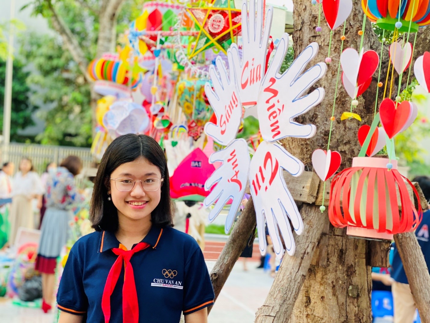 Hạ Vy trong buổi thuyết trình Bộ sưu tập đèn lồng của lớp 7A3
