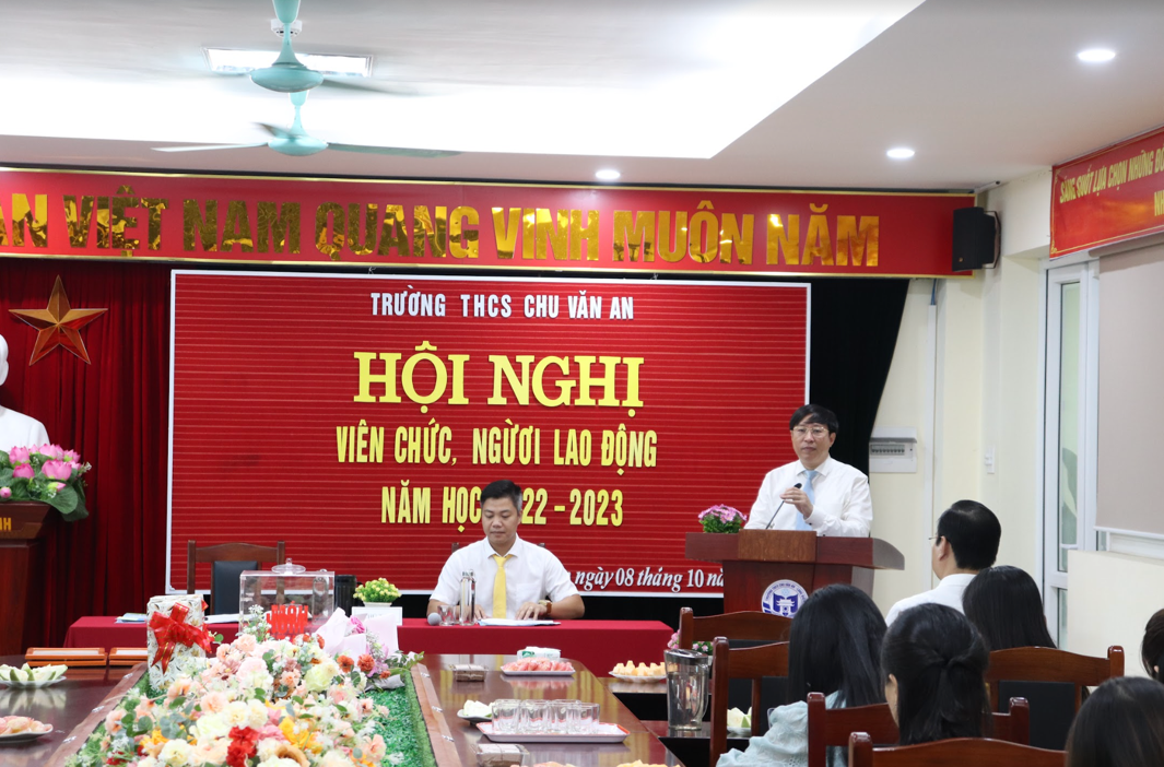 Trong không khí mát dịu của mùa thu ngày 08/10/2022, Trường THCS Chu Văn An quận Long Biên long trọng tổ chức Hội nghị viên chức, người lao động năm học 2022-2023 với sự tham gia đầy đủ và đúng giờ của tất cả CB, GV và CNV nhà trường. Hội nghị được tổ chức thường niên nhằm phát huy dân chủ, trí tuệ của cán bộ giáo viên và nhân viên nhà trường, đưa ra nghị quyết nhằm nâng cao chất lượng quản lý, chất lượng giáo dục, đề xuất các biện pháp để thực hiện tốt nề nếp, kỷ cương của nhà trường, cải tiến phương pháp dạy và học, hoàn thành thắng lợi nhiệm vụ năm học.