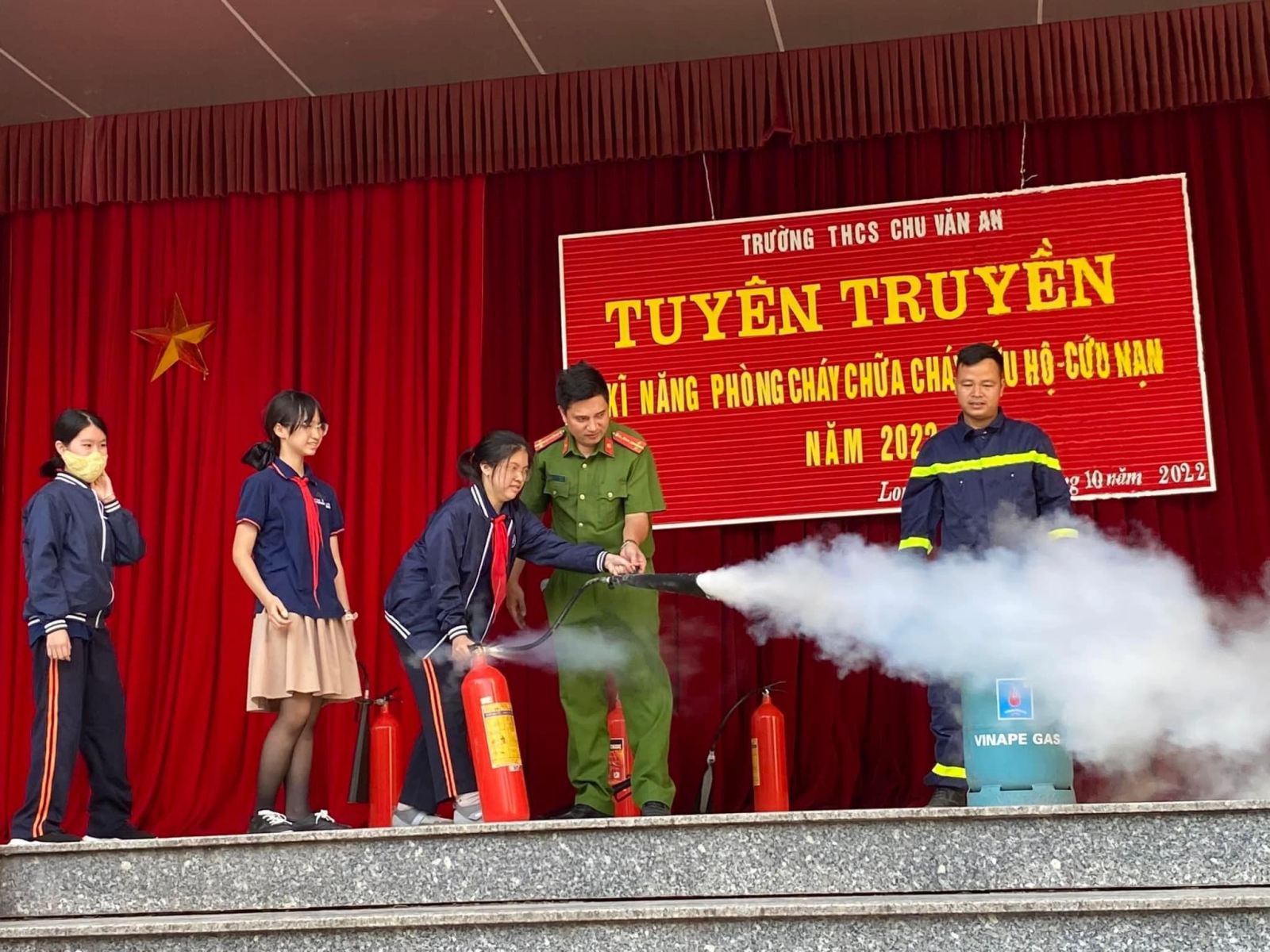 Thực hiện công tác phòng cháy chữa cháy trong trường học, chiều ngày 13/10/2022 trường THCS Chu Văn An đã phối hợp với các cán bộ PCCC và cứu nạn cứu hộ Công an quận Long Biên tổ chức buổi tập huấn cho toàn thể cán bộ, giáo viên, nhân viên và học sinh. Đây là hoạt động thường niên của nhà trường nhằm trang bị những kĩ năng cần thiết trong PCCC.