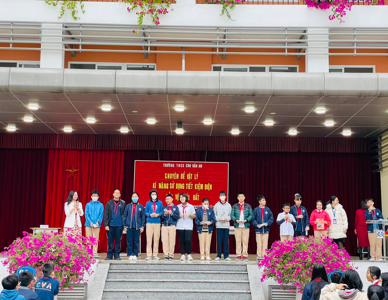 Kỹ năng tiết kiệm điện để bảo bệ Trái Đất”. Cuộc thi gồm 4 đội chơi, tương ứng với 4 khối, mỗi đội gồm 3 bạn học sinh xung phong tham gia dự thi. Các đội thi đua trả lời nhanh 10 câu hỏi về kỹ năng tiết kiệm điện. Các bạn học sinh của Trường THCS Chu Văn An đã rất hào hứng tham gia cuộc thi này.