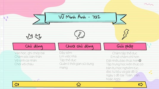 Như vậy, bước vào 2 tuần thực hành thói quen thứ nhất trong 7 thói quen hiệu quả- Thói quen Sống chủ động, các em học sinh đã tự nhìn ra được những thói quen chủ động và chưa chủ động của bản thân. Từ đó các em đã tự đưa ra một số giải pháp. Hi vọng với những tấm thẻ thực hành trong Hợp đồng 7 x 7, các em sẽ tự tạo ra những bước đột phá cho bản thân, là động lực để các em vươn tới thành công và gần nhất là giúp các em học tập có hiệu quả cao tại mái trường Chu Văn An thân yêu.