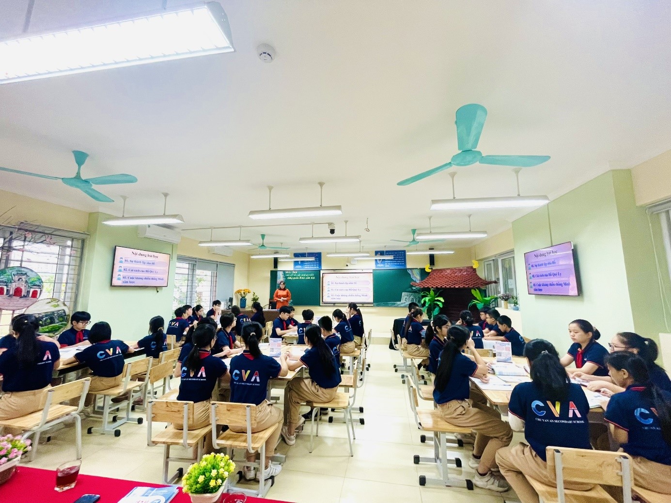 Trong tiết học này, các con không chỉ được hiểu thêm về lịch sử dân tộc, mà còn được phát huy năng lực giao tiếp và hợp tác qua các hoạt động thảo luận nhóm và tranh biện về sự thành lập của nhà Hồ. Khi một triều đại suy yếu, sẽ có thế lực khác lên thay thế. Đây chính là một quy luật tất yếu của lịch sử. Từ sau thế kỉ XIV, nhà Hồ khủng hoảng toàn diện, hàng trăm cuộc khởi nghĩa bùng nổ khắp nơi. Trước bối cảnh đó, Hồ Quý Ly đã ép vua Trần chuyển kinh đô vào Tây Đô (Thanh Hóa); phế truất vua Trần, lên ngôi vua, lập ra nhà Hồ và đặt tên nước là Đại Ngu. Với sự dẫn dắt và định hướng của giáo viên, học sinh đã cùng nhau thảo luận, tranh biện để hiểu được ý nghĩa của việc chuyển kinh đô và quốc hiệu của nhà Hồ.