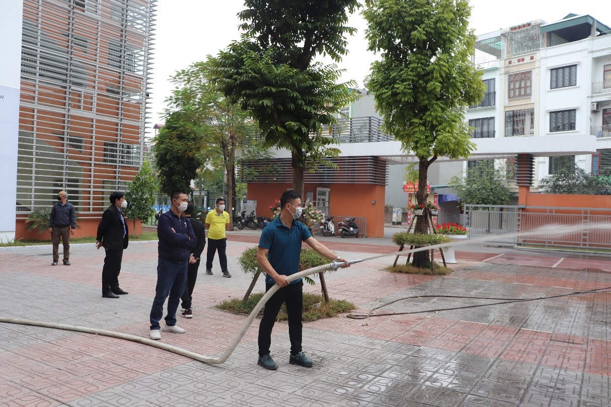 Nhân viên nhà trường tích cực thực hành sử dụng các dụng cụ chữa cháy khi có sự cố xảy ra