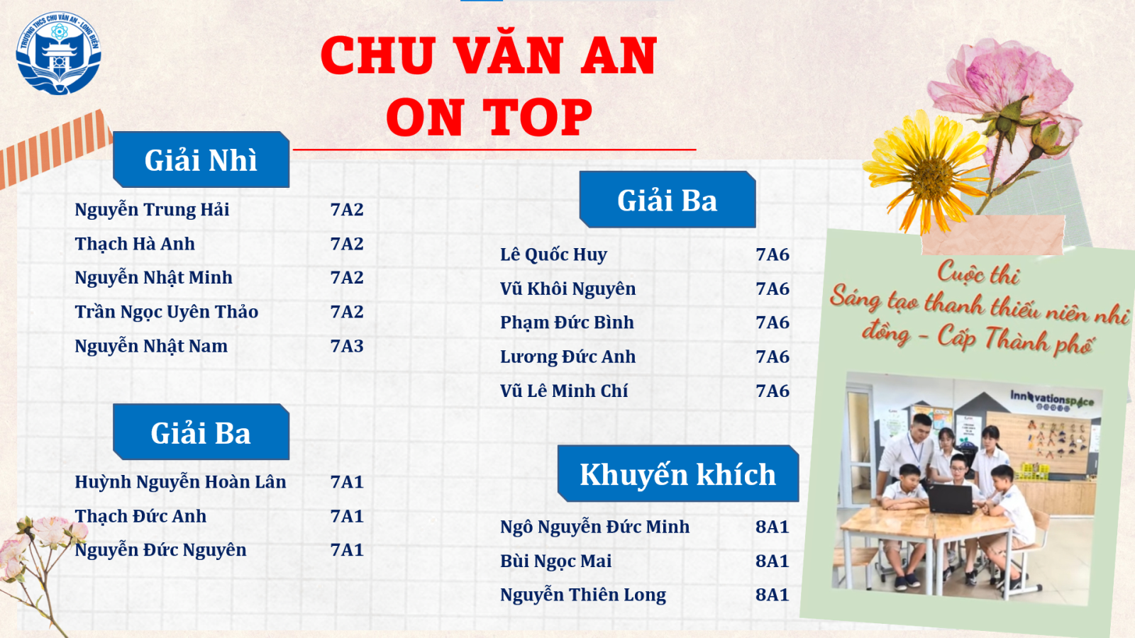 Năm học 2020 – 2021 là một năm học thách thức cho ngành Giáo dục nói chung và cho trường THCS Chu Văn An nói riêng do dịch Covid-19, tuy nhiên không vì thế mà các học sinh THCS Chu Văn An ngừng cố gắng. Không những vậy, các con lại càng thêm động lực vượt qua khó khăn để chứng minh bản thân, mang về thật nhiều giải thưởng trong các cuộc thi về Khoa học Tự nhiên. Bên cạnh các cuộc thi qui mô Quốc gia và Quốc tế, Thành phố Hà Nội cũng đã tổ chức những sân chơi Khoa học giáo dục vô cùng lí thú và hấp dẫn dành cho học sinh các cấp, điển hình là cuộc thi “Sáng tạo thanh thiếu niên nhi đồng – Cấp Thành phố”. Học sinh THCS Chu Văn An đã khẳng định được vị thế của mình, CVA-ers tự hào đem về các giải thưởng cao trong cuộc thi: 01 giải Nhì, 02 giải Ba và 01 giải Khuyến khích.